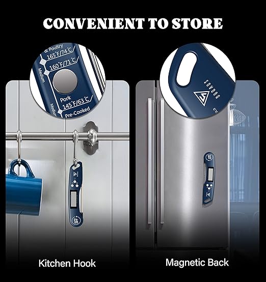 - CLEAR AND REVERSIBLE DISPLAY: You will get the clarity temperature with the bright and large LCD screen, also you can read the food temperature in the dark while grilling with backlit button! Or press for 3s to switch ℃/℉. And the Exclusive auto-rotating display rotates automatically depending on how the instant read food thermometer is held and enables you to read the numbers from any direction which is convenient for right or left-hand persons to use, letting you enjoy every step of cooking!