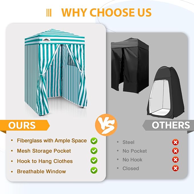 - WHAT’S INCLUDED: Canopy Frame, 140g polyester top fabric, sidewalls with easy-entrance zipper for complete enclosure, 2 hooks to hang clothes, towels etc, a mesh storage pocket, and carry case .