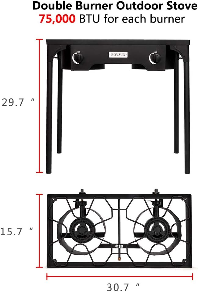 - 🔥150,000 BTU OUTPUT: Supplied with two separate burner, (75,000 BTU for each) you can cook much food in the same. Each burner has individual knob to control heat. Ideal to make family meals like frying fish/chicken, steaming crabs, wok cooking.