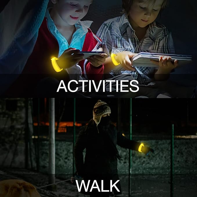 - 【Multi-Usages】:Nicely visible while walking, riding, running, or on a motorcycle at night. Secure enough that you don't have to worry about it flying off at higher rates of speed. Also perfect for dog collar when night walking. Great party supplies. Enough for you to share with your families and friends. Kids always love this light up bracelets. Age grading: 3 + years old