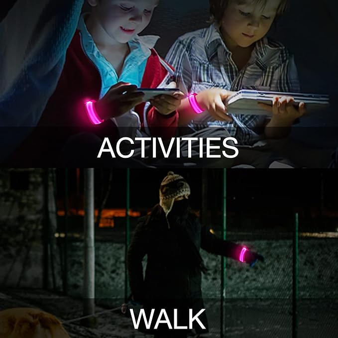 - 【Multi-Usages】:Nicely visible while walking, riding, running, or on a motorcycle at night. Secure enough that you don't have to worry about it flying off at higher rates of speed. Also perfect for dog collar when night walking. Great party supplies. Enough for you to share with your families and friends. Kids always love this light up bracelets. Age grading: 3 + years old