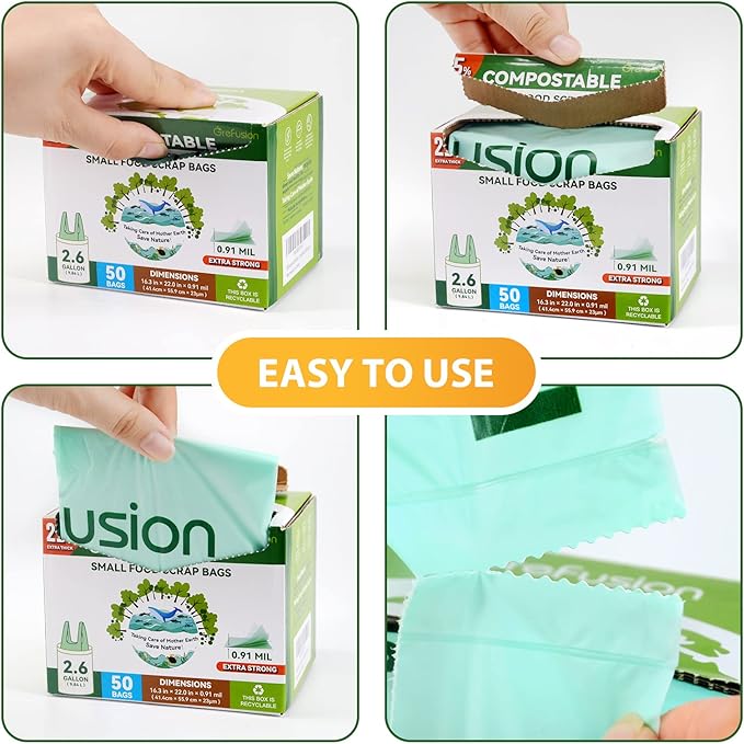 - 【2.6 GALLON COMPOSTABLE BAGS&UPDATE THICKER BOTTOM 】Even liquids gather at the thicker bottom but with no tear . The kitchen trash bags features of sturdy same as regular plastic bags but no harmful to the earth than it.If you're tired of cleaning your compost bin every day or using flimsy trash can kitchen bags causing spilling out, Now the Surper Strength GreFusion garbage bags is a great life saver for your Health & Household cleaning working.