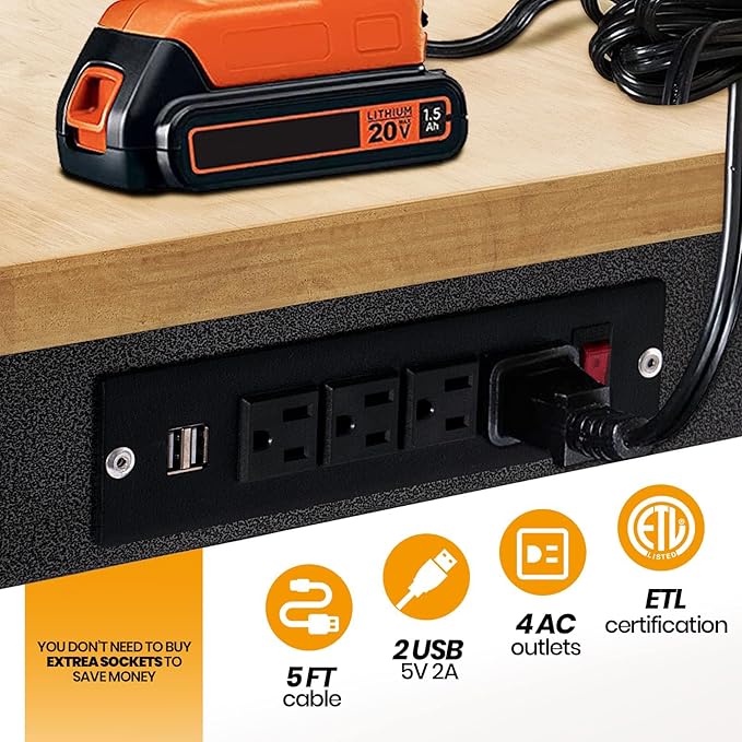 - 【Power Strip】:We fitted a power outlet for the work bench.Convenient for you to use a variety of power tools and lamps. sewing table has 4 AC Outlets and 2 USB-A ports on the power strip.