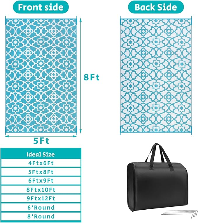 - Versatile Outdoor Carpet: The indoor outdoor plastic rugs have multiple choice in different colors(4'x6',5'x8',6'x9',8'x10',9'x12',9'x18',8'round), is ideal for a variety of indoor outdoor activities,like patio mat, deck rug, garden rug, beach mat, picnic mat, BBQ party mat, rv camping rug,pool rug,outdoor doormat,garage rug,front door mat,allowing you to have plenty of imaginable space for more fun.