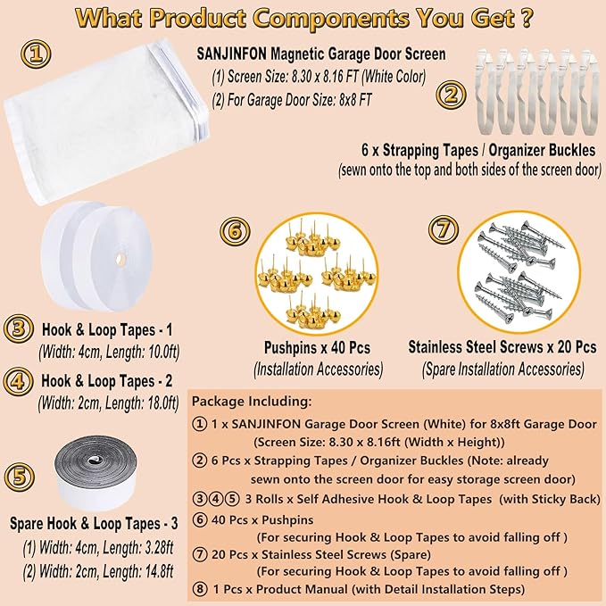 - [Easy to Storage, Temporarily Store Off-season (Autumn / Winter)] - The screen mesh net of this 8.3x8.16ft garage door screen is retractable, detachable, can be tightly twisted and folded with the included 6 strapping tapes (storage belts). 6 storage belts: 4 strapping tapes (On the net top) and 2 strapping tapes (On the net side) to facilitate storage in the off-season (Autumn / Winter), achieving one-time installation and lifetime use.