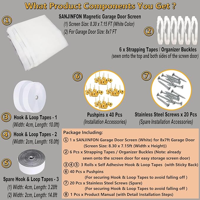 - [Easy Installation with Strong Magnets & Full Frame Magic Tape] - Installing our magnetic garage door privacy screen kit is a breeze! With 40 strong magnets and full-frame hook-and-loop strips (with heavy-duty adhesive), you can set this garage net screen up in minutes. For added durability, we include 20 stainless steel screws and 40 push pins to secure the screen firmly, preventing the adhesive from falling off. Perfect for DIY enthusiasts and anyone looking for a quick, hassle-free solution!