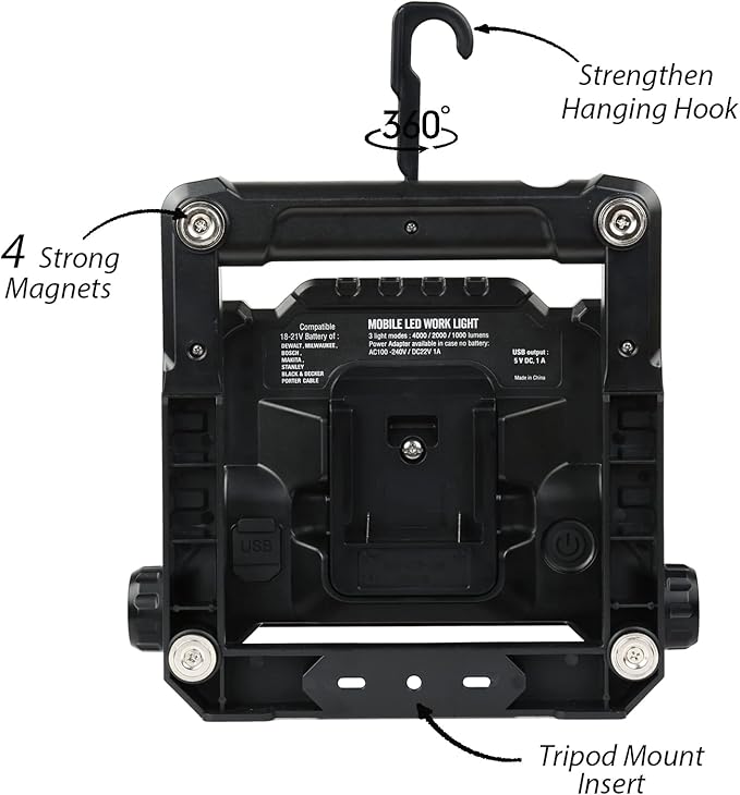 - Compact and Lightweight: Foldable work light with the 180° rotating stand and integrated 360° swivel hanging hook for easy work, carrying, and storage