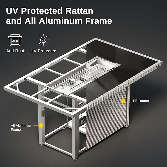 - NO WORRY ABOUT RUSTING AND FADING- 100 percent aluminum frame design won't rust, and is paired with a tempered glass table top, 304 stainless steel burner, and UV-protected rattan covering, all dedsigned to protect the outdoor fire table effectively from cracking or discoloration. Keep the lid on when not in use to prevent rain from entering inside the body. Multiple weather-resistant designs make it long-lasting.