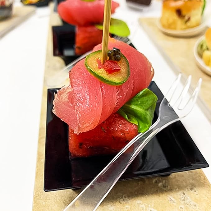 - ๐งโ? Professional-Grade: Premium verrine mini square plastic tray great to use as mini dessert plates! Impress your guests with these dinnerware sets of black disposable plates as your go to dip bowls for your next party.