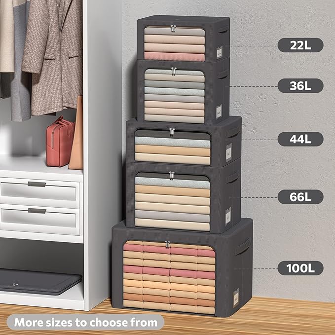 3Pack Stackable Clothes Storage Bins - Oxford Frame Storage Box Foldable Clothing Storage Container Organizer Set with Clear Window & Carry Handles Large Capacity (Dark Gray, Large-66L)
