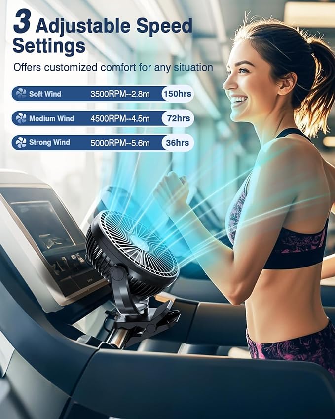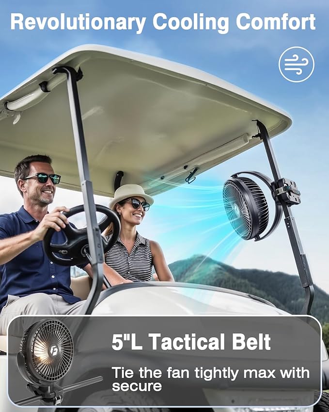 - Secure & Steady: This clip-on fan features a 5-inch tactical strap for a rock-solid grip. Perfectly stays put on golf carts, camping gear, or any outdoor adventure. Built tough for reliable wear