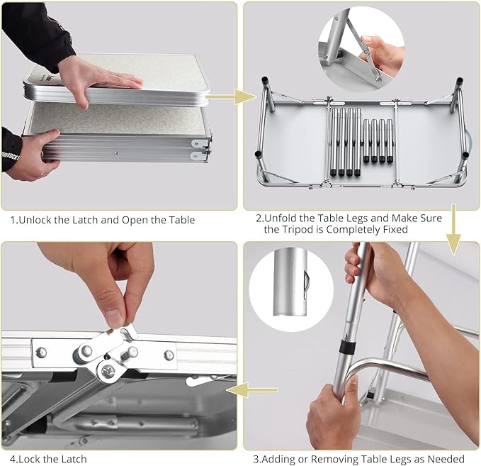 - High Quality Material, Sturdy and Durable: The entire frame of portable table is made of thicker aluminum alloy, which is very solid and durable. MDF (Medium Density Fiberboard) tabletop is smooth and easy to clean. You can easily remove stains by simply wiping with a damp paper towel