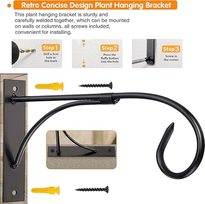 - ???�WALL MOUNT PLANT HOOK?‘Set of 2 Decorative Plant hanging bracket (Screws Included). The plant bracket is compact in size, good surface finishing. Enough plant putting space, with the distance (11in/28cm) to the wall, they are suitable for the larger flower pots for hanging. Styling sprouts to life when you add your most loved plant to this wall brackets.