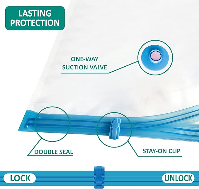 - Reliable protection: With the triple-seal turbo valve & double-zip seal design, our vacuum bags get the air out in the suction process. Can be used repeatedly.