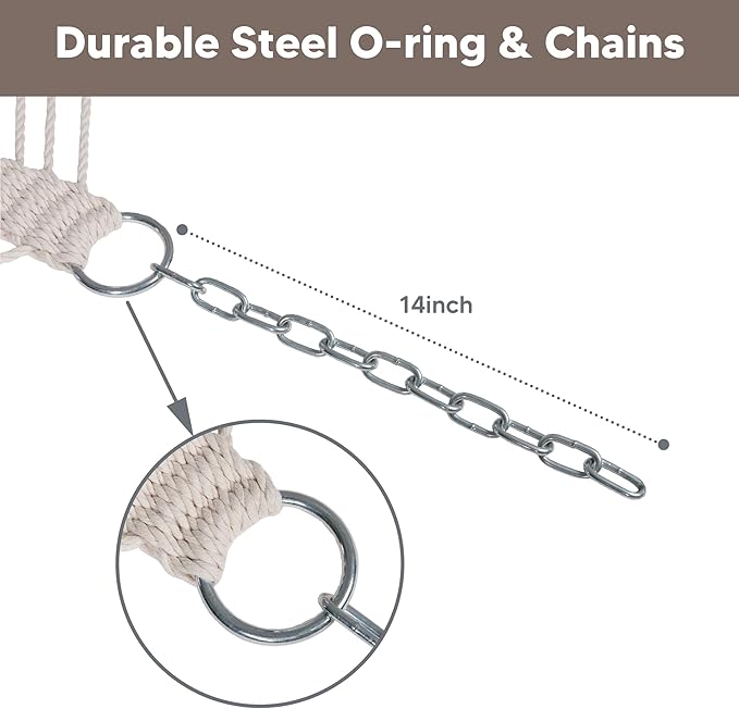 - Handcrafted Ropes: The heavy duty ropes are hand-woven with comfortable, long-lasting thread twists done by hammock artisans. 18 strong ropes are connected together and woven into a beautiful triangle pattern, which attaches to O-shaped steel ring