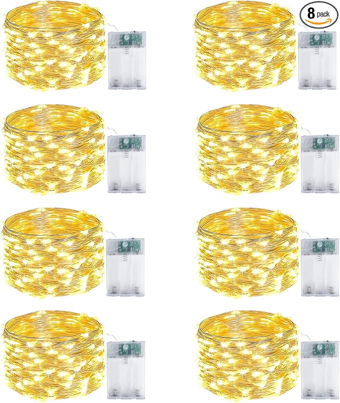 - Ultra-Bright and Durable Battery Fairy Lights: Designed with ultra-bright LEDs and durable silver wire, these battery-operated lights are built to last and make an excellent choice for decorating bedrooms, centerpieces, balconies, decks, and porches. Each set includes 8 strands of lights, each 16ft long with 50 LEDs, powered by 3 AA batteries (not included)