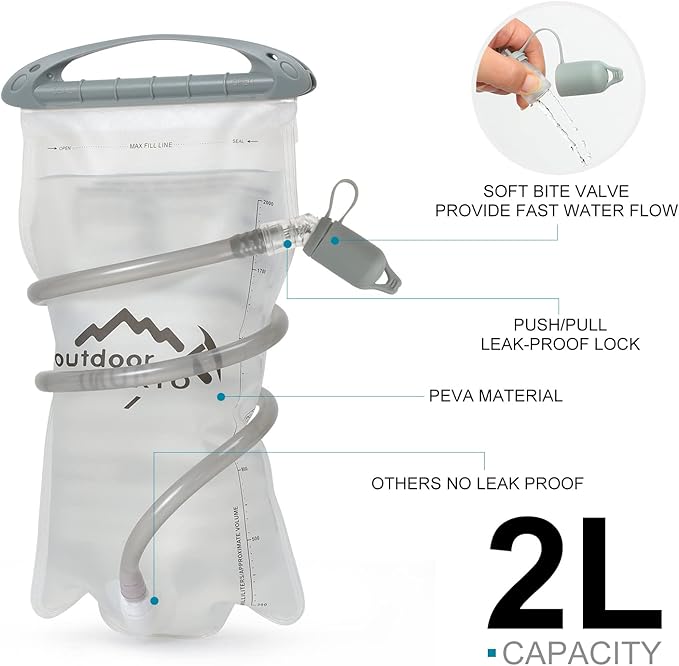 - đ´âăPremium Quality Water BladderăThe Hydration Pack Backpack comes with a 2 liter hydration water bladder and two 250ml soft flask. A switch valve and a cover cap make double leak-proof. Large opening allows quick filling of water and ice and it is easy to clean, the water line (40"length,0.4"diameter) provides a wholesome flow for easy drinking keeps your water tasting fresh, all day. The water temperature is range -20~+50â.