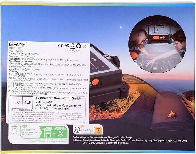 ERAY Portable LED Work Light with Rechargeable Battery 15000mAh 10000 LM, Solar Camping Lights, IP66 4 Lighting Modes Worklight for Outdoor Building Emergency Car Repairing