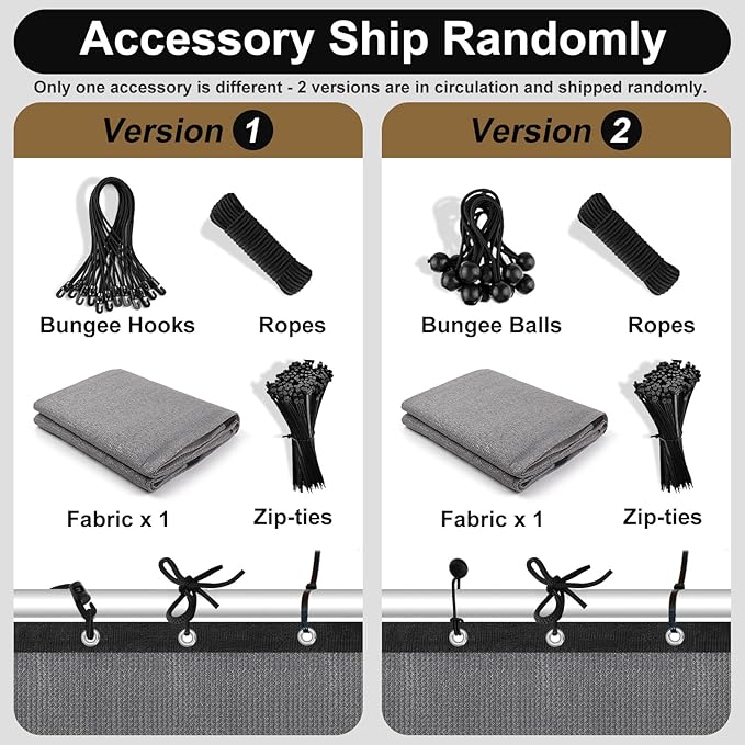 - Accessory Updated: Accessories have been updated from [Zip-ties, Ropes, Bungee Balls] to [Zip-ties, Ropes, Bungee Hooks]. Both versions are in circulation and will be shipped randomly. Versatile Use: Perfect for outdoor spaces like patios, lawns, gardens, and pergolas. Additionally, it serves as an effective privacy screen, windbreak, plant cover, and finds applications in greenhouses, coops, kennels.