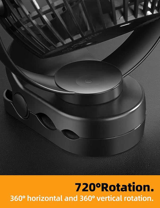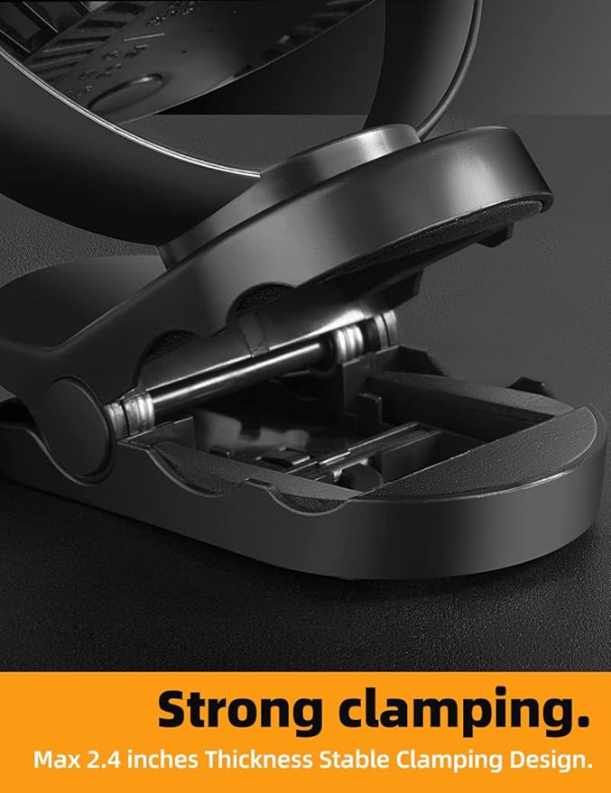 - 【720°Rotation & Timing Function】This fan clip can be placed very securely or clamped anywhere you want, The portable clip on fan has a nimble head that can rotate 360°degrees vertically and horizontally, so you can stay cool from any angle perfectly. Meanwhile, The Battery desk fan has 360-degree adjustable rotation—no need to stand up or stretch out your arms to adjust the fan. Set the timer function to turn off after 1 hour/3 hours/5 hours automatically.