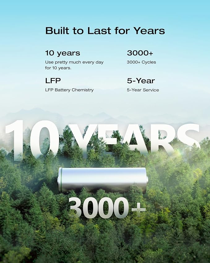 - [Long-lasting LFP Battery and Solar Panel] Using LiFePO4 battery cells, use and recharge RIVER 2 Pro more than 3000 times before hitting 80%. That’s almost 10 years of regular use. RIVER 2 Pro includes advanced BMS protection, monitoring voltage, current, and temperature to keep LFP battery running for years. 160W solar panel has a seamless design that is rated IP68 waterproof, making it perfect for outdoor activities. ETFE film provides additional UV protection to extend the panel's lifespan.