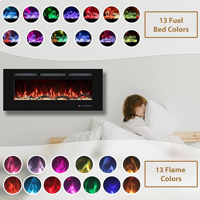 - MULTICOLOR FLAMES: The indoor faux stove features 13 flame colors and 13 fuel bed colors to suit your mood. Two optional medias: CRYSTAL and LOGSET. In addition, you can change the colored stones you wanted.