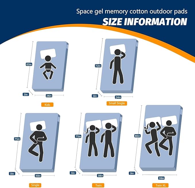 - 【MULTI-SIZE OPTIONAL & AFTER-SALES SERVICE WITHIN 24 HOURS】 5 sizes for you to choose from camping mattress full size, kids (63x26x3") small single (72x24x3”) single (75x30x3”) twin (75x38x3”) twin xl size (80x38x3”), Be sure to choose the most suitable size. Since we shipped by vacuum compression packaging, please Open the package and place it for about 24-48hours. If you have any question, feel free to contact us. Please believe that we will solve the problem for you within 24 hours.