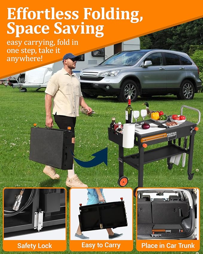 - Folds Flat Quickly Bbq Cart - Our universal griddle stand are collapsible, eliminating the need for tedious screw mounting steps and requiring no tools,while its 20-second instant setup means you'll be up and running in no time.