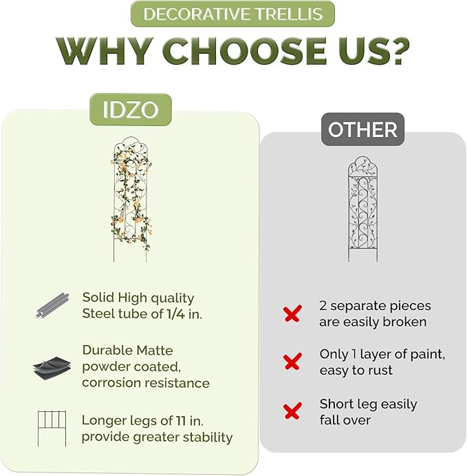 - š BUILT FOR LONG LASTING BEAUTY: The high quality steel trellis for climbing plants with outstanding strength and durability provides solid support for climbing plants; Its powder coating protects it from rust and corrosion, ideal for outdoor use
