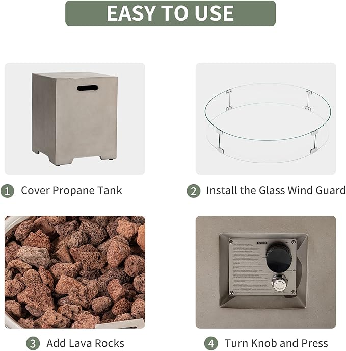 - 🔥 【 Fireplace-in-the-round】: It's like having a fireplace wherever you want it! The low profile of this elegant fire table just beckons you to gather round it and tell stories. Clean burning propane flame provides soothing warmth with electronic ignition, safety valve for easy start, gentle lighting and a centerpiece for many outdoor evenings worth remembering.