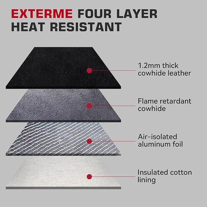 - Excellent 4-layer Heat Resistant: The welding gloves are constructed with 100% heavy-duty flame-resistant split cowhide, featuring double-reinforced layer padding, high-temperature-resistant aluminum foil, and a soft insulated cotton lining. They can withstand super high temperatures up to 932℉, providing protection against extreme heat, ultraviolet, and infrared radiation during welding.