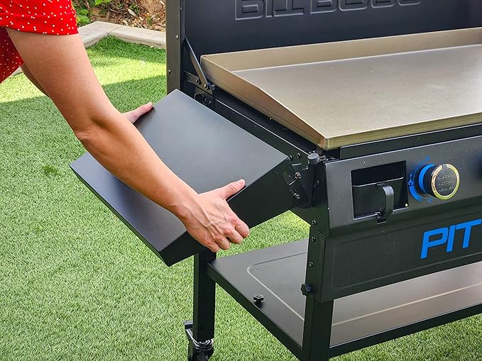 - Features folding side shelves with tool hooks + an embossed steel bottom shelf for food prep and storage