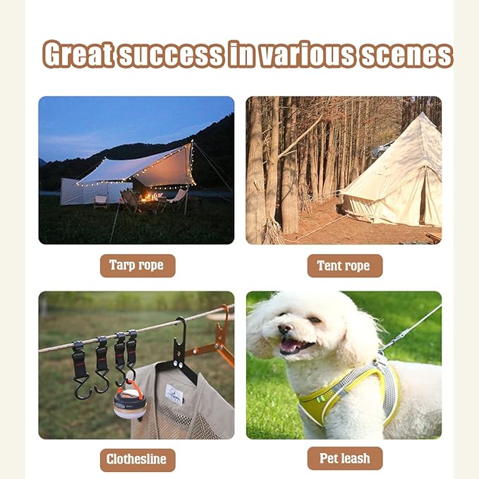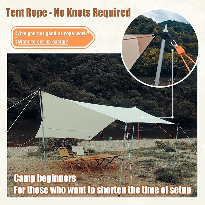 - 🌳Make Camping Easier and Faster:Only need hook the hammock,tent tarp or tent stakes by the carabiners,then use the pulley to adjust the rope length for you need,reduce the set up time and eliminates time-consuming hitch knots;