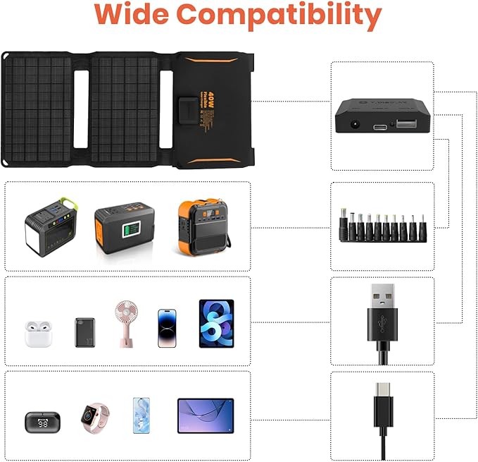 - 【40W Solar Panel Charger】The 40 Watts solar panel with 3 different ports of quick charging USB-A QC3.0 18w(Max) , USB PD 2.0 15w(Max) and DC 40W( Max) ports to directly connect and charge smartphones, tablets, headphones, power bank, speakers, camera, meet almost all 5V and USB devices.