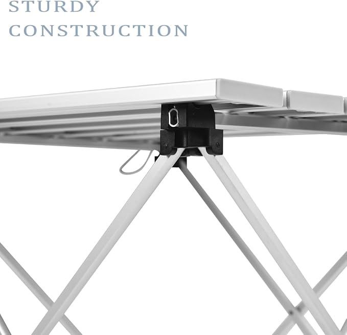 - Sturdy Construction ---- Our folding camping table is made of heavy-duty aluminum, the legs will not fold, bend or fall off with the stable foot cap, allowing it to be used on different terrains without the risk of tipping over. The triangular frame and sturdy joints make the foldable camping table can support 55 pounds of weight. So you can use this table for picnics or cooking with complete confidence