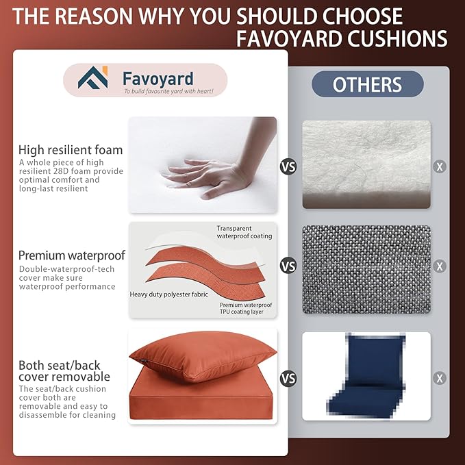 - Double-Waterproof Tech Cushion Cover: Favoyard outdoor cushions for patio furniture choose 300GSM high density polyester fabric for the cover could provide excellent waterproof and dust resistance ability. In addition, there is a TPU coating on the reverse side of the fabric. Both the TPU coating and the fabric are highly waterproof.