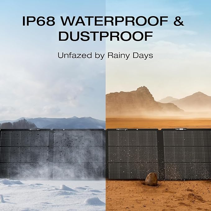 - [Lightweight & Waterproof] 220W double-sided solar panel is foldable and compact, weighing only 15.4 lb, making it easy to carry or store. With a thin tempered glass design, it's 5 times more durable than similar solar panels. Its IP68 rating makes it both water-resistant and dustproof.