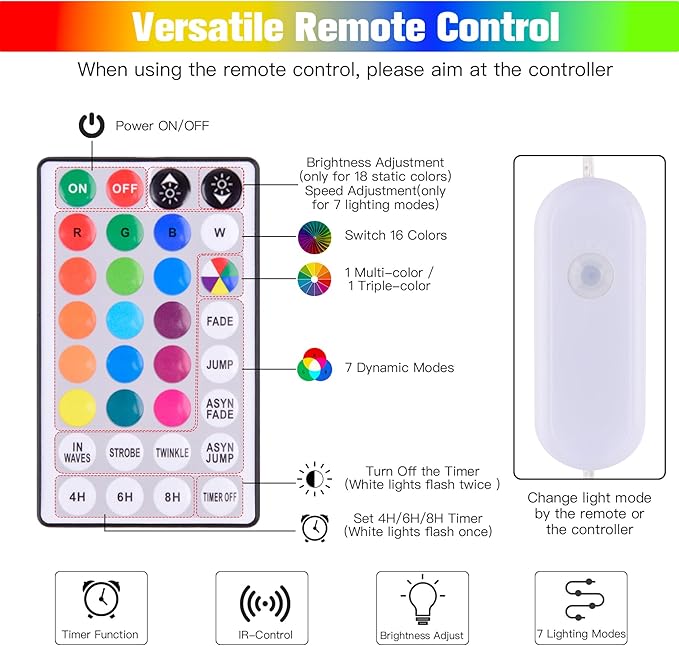 - Memory Function & Timer: You can select 7 different modes by remote: Auto, Fade, Jump, ASYN Fade, ASYN Jump, In Waves, Strobe, and Twinkle. 4-speed levels to satisfy your diverse needs to adjust the mode color speed and solid color brightness. Moreover, the remote has a memory function to ensure that the plug in rope lights dimmable stay in the mode you chose last time and 4, 6, and 8 hours Timer. You can easily automate the operation of your product, saving your time and effort
