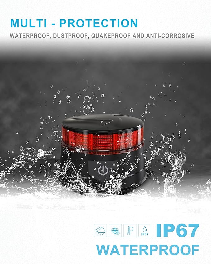 - 【HIGH QUALITY】Beacon LED red lights are made of durable ABS material and crystal-clear PC mask; outputs maximum brightness; compliant with EMC R10, ECE R65, SAE J845 certification; durable for 50,000 hours with an IP67 waterproof rating; ensure full charge with 12 or 24V input voltage before use