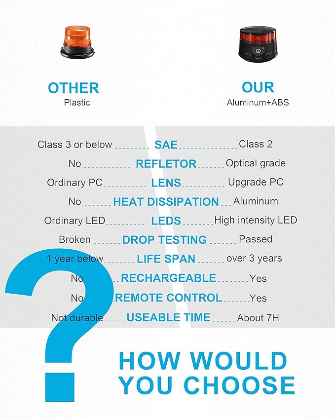 - 【RECHARGEABLE AND MULTI-APPLICATION】Rechargeable beacon red light includes overcharge, overdischarge, and overtemperature protection; fully charges in 4 hours for up to 6.5 hours of use; suitable for emergency vehicles, construction trucks, snow plows, shovels, tractors, golf carts, UTV vehicles, school buses, postal services, and safety alerts