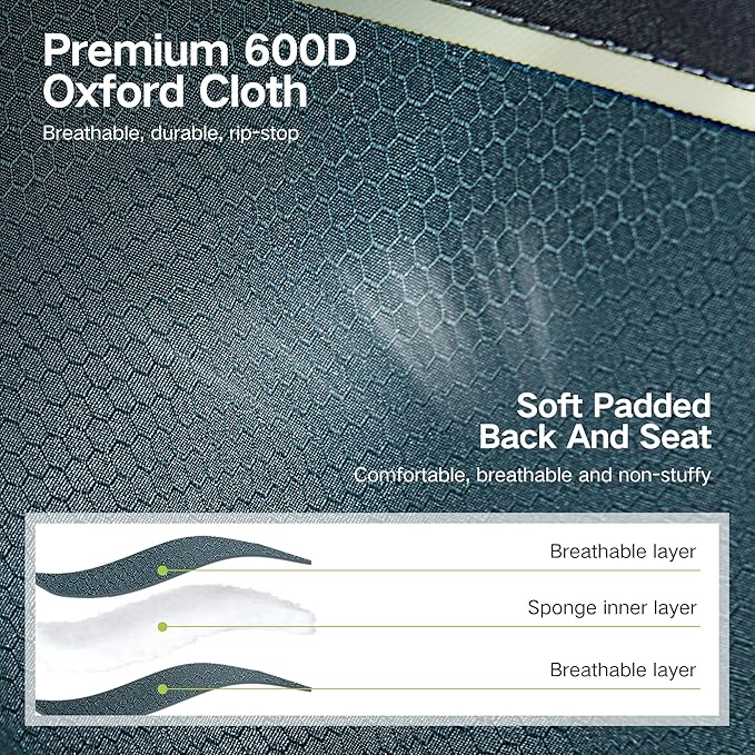 - 【CAMPING CHAIR With Premium Material】 The lawn chair with ergonomic padded back, seat and armrest provide max comfort for your body. The durable double-layer 600D padded oxford fabric with powder-coated steel tube frame enables you deserve a comfortable and safe chair