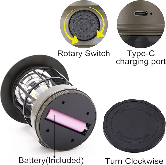 - 1. This rechargeable camping lantern is the combination of retro style and the latest COB LED technology, provides 360°illumination, Suitable for those strive for cozy lifestyle, Suitable for outdoor or indoor use, It's also a good gift.
