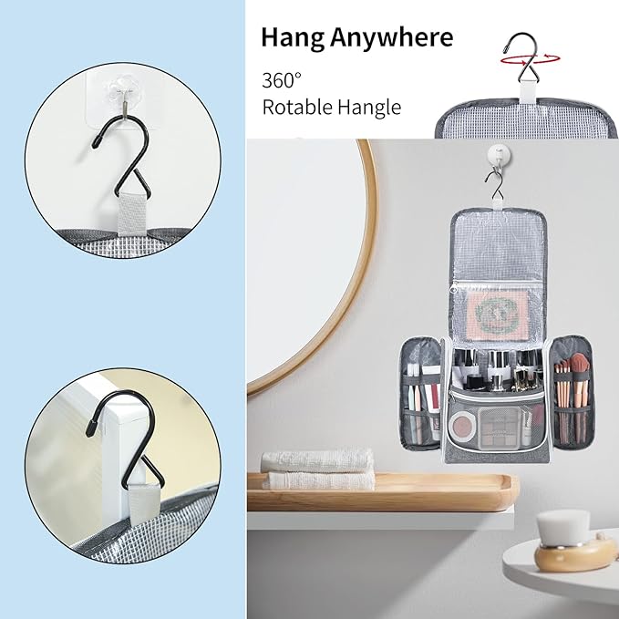 - Sturdy Metal Hooks: The sturdy hooks allow you to hang your toiletry bag on any hook, door, rod, etc. and can be rotated 360° for easy access