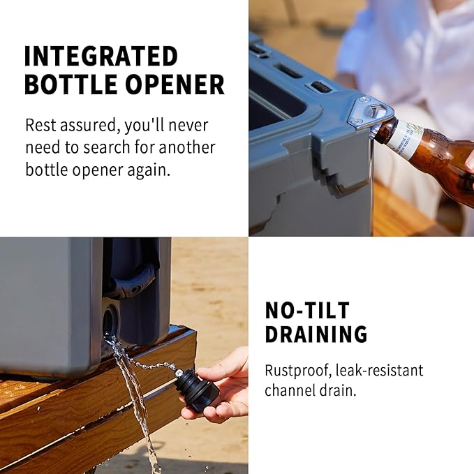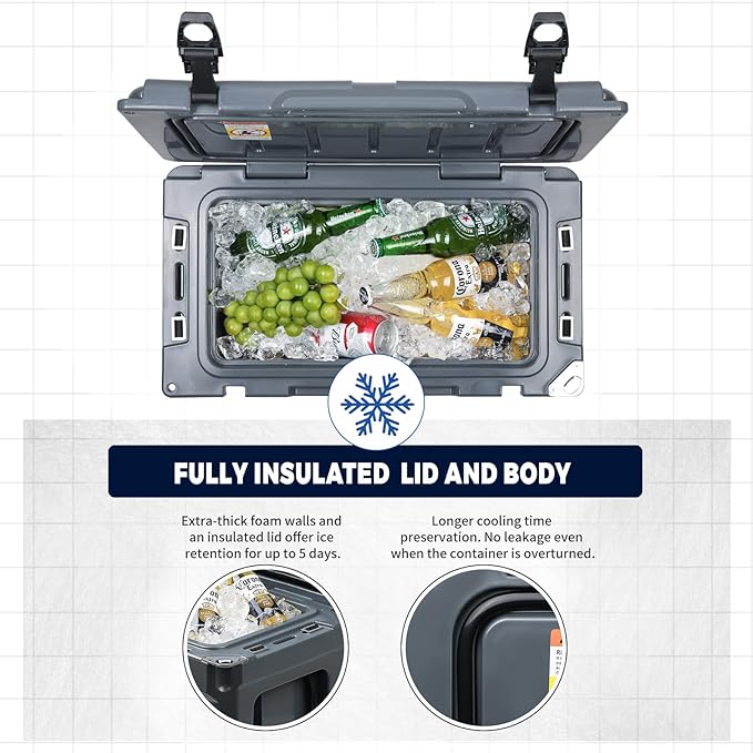 - QUALITY MATERIALS: Crafted with seamless LLDPE using rotomolding technology, our coolers feature UV-resistant exteriors and food-safe interiors. The impact-resistant, one-piece design withstands extreme outdoor abuse while maintaining structural integrity - no cracks, leaks, or warping under 310+ lbs weight capacity.