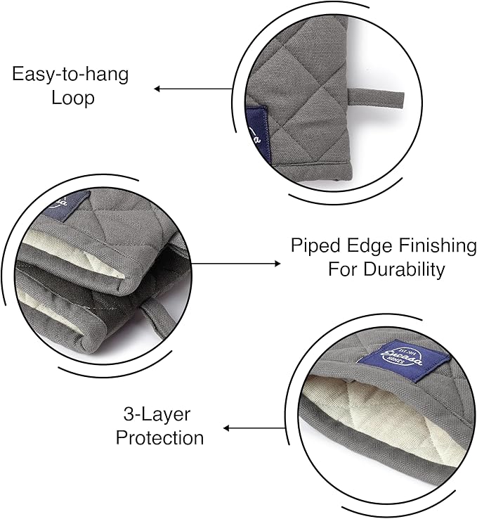 Encasa XO Heat Resistant Cotton Oven Gloves Mitts (2 Pc Set) - Quilted & Safe 12x7 in - for Kitchen, Cooking & Baking, Grilling, Handling Hot Pots & Pans - Grey