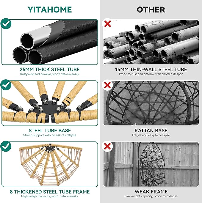 - COMFORTABLE EGG CHAIR: Our hammock chair used a combination of solid steel frame and rattan to increase strength, have weatherproof and durability, and are equipped with comfortable and soft PP cotton cushion, so that you can enjoy while ensuring your safety
