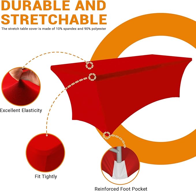 - DURABLE & SPANDEX: The stretch spandex rectangular table cover was made from 10% Spandex, 90% Polyester material, wrinkle and stain resistant stretch spandex fabric with a 200 GSM, which make tablecloth more stretchable and durable, does not require ironing and can be laundered countless times.