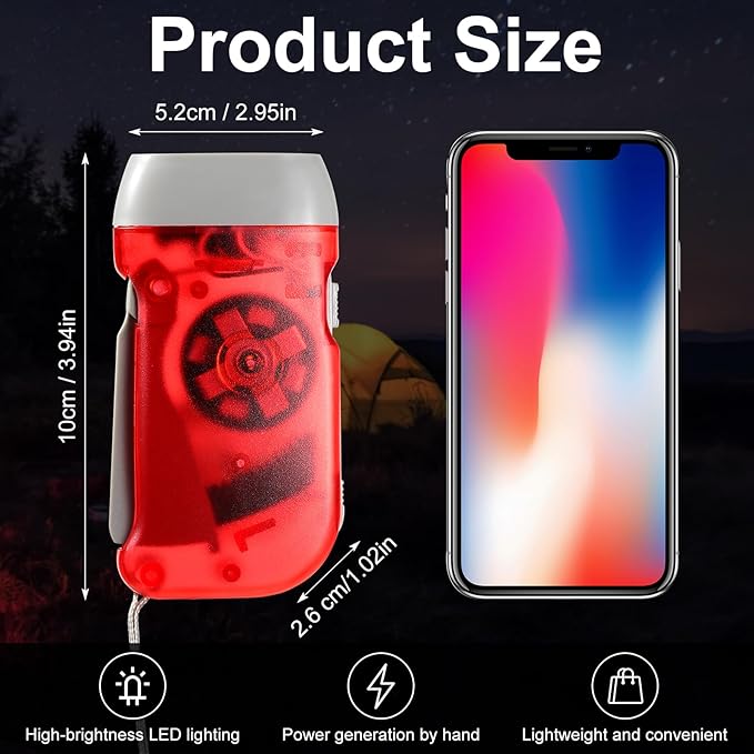 - No Battery Required: with the built in micro power generation device, you only need to squeeze the handle of the manual powered flashlight a few times with one hand, which can generate electricity automatically, it is energy saving so that you do not need to buy batteries