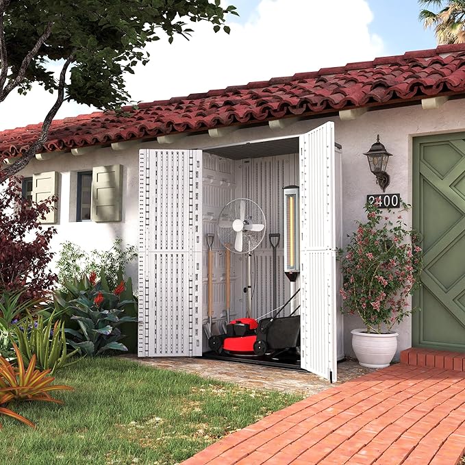 - 【Durable shed】 This storage shed is made of double-layer resin sheet which is treated with blow molding technology to provide stronger wind and impact resistance, not easy to bend or puncture, the resin material is highly weather resistant, it can be used in all-weather and it is also easy to clean and maintain, suitable for outdoor use all year round.
