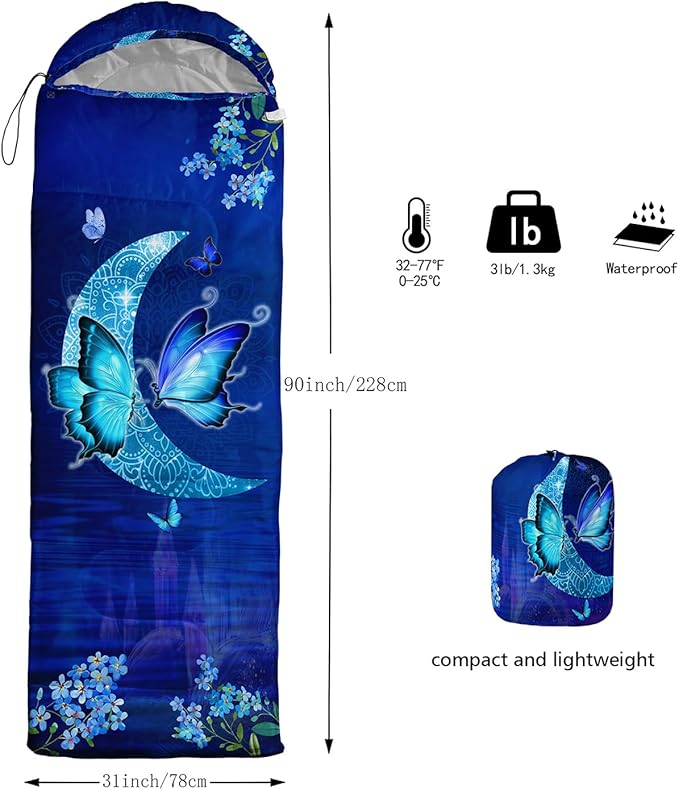 - 🌈【Fashion Design】SIZE - 31 by 90 inches (W x D). Our sleeping bag can be used in 3 seasons with a design temperature of 32℉-77℉(0℃-25℃). These bags also have a weather resistant waterproof design to keep you warm and prevent you from any dampness.